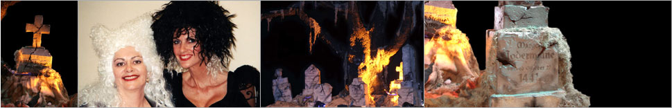 Donna's new set design, a 20-foot high, spooky, tree with limbs/arms, spanned the width of the stage and loomed over an extraordinary graveyard.